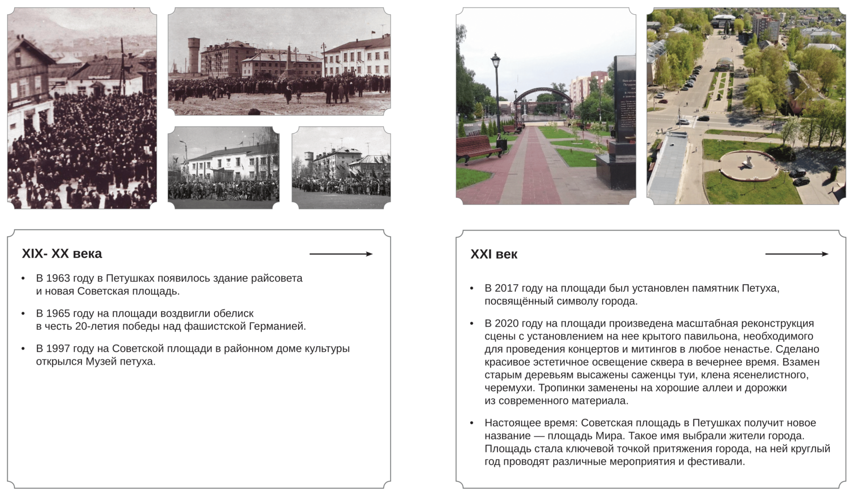 В основе концепции лежат ключевые ассоциации, отражающие дух Петушков и идею мира. Эти образы формируют основу для дизайна и атмосферы площади, создавая запоминающееся место.