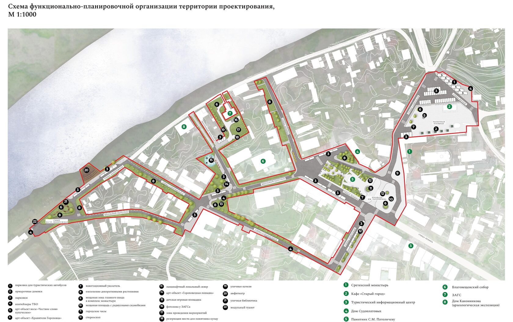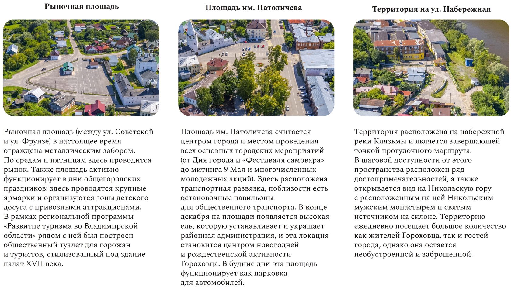 Территории проектирования располагаются в историческом центре Гороховца: площадь и сквер им. Патоличева, рыночная площадь, сквер на ул. Набережная, территория рядом с Домом купца Опарина (ЗАГС) расположены в границах ул. Ленина, ул. Саваренского, ул. Набережной, пер. Школьного и ул. Советской. Все площади являются частью посада и часто посещаются как самими гороховчанами, так и многочисленными туристами, так как входят во все туристические маршруты Гороховца.